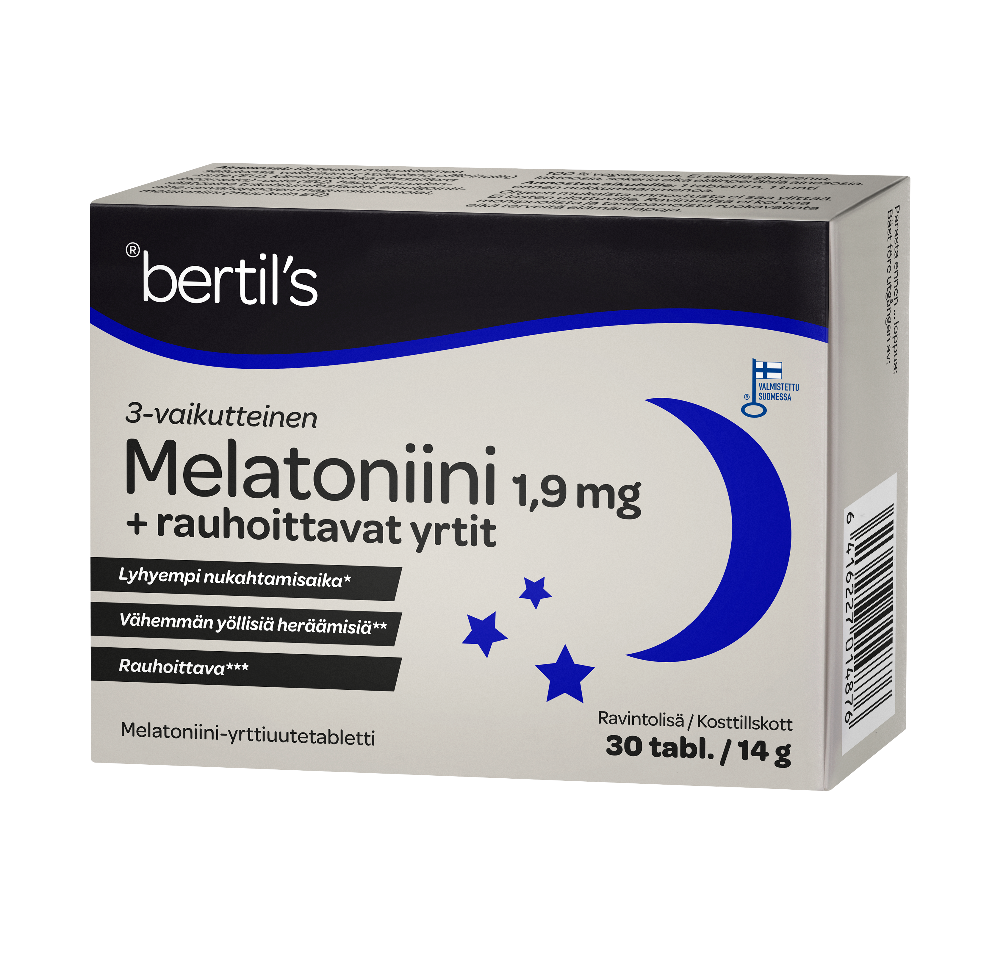 Täyteaine mikrokiteinen selluloosa, valeriaana (Valeriana officinalis) -uute (EU), kärsimyskukka (Passiflora incarnata) -uute (EU), happamuudensäätöaine trikalsiumfosfaatti, emulgointiaine rasvahappojen magnesiumsuolat, melatoniini (muu kuin EU).